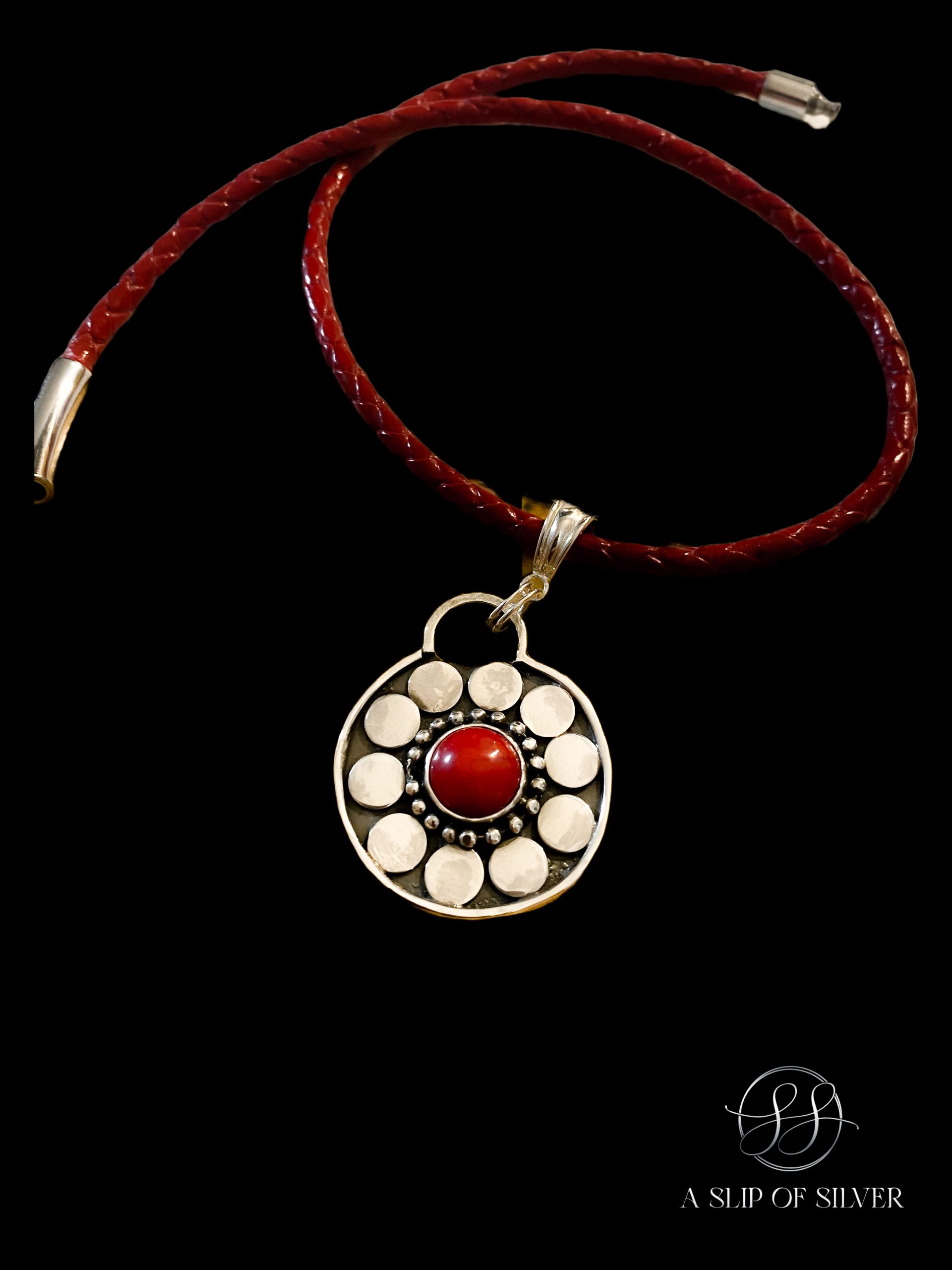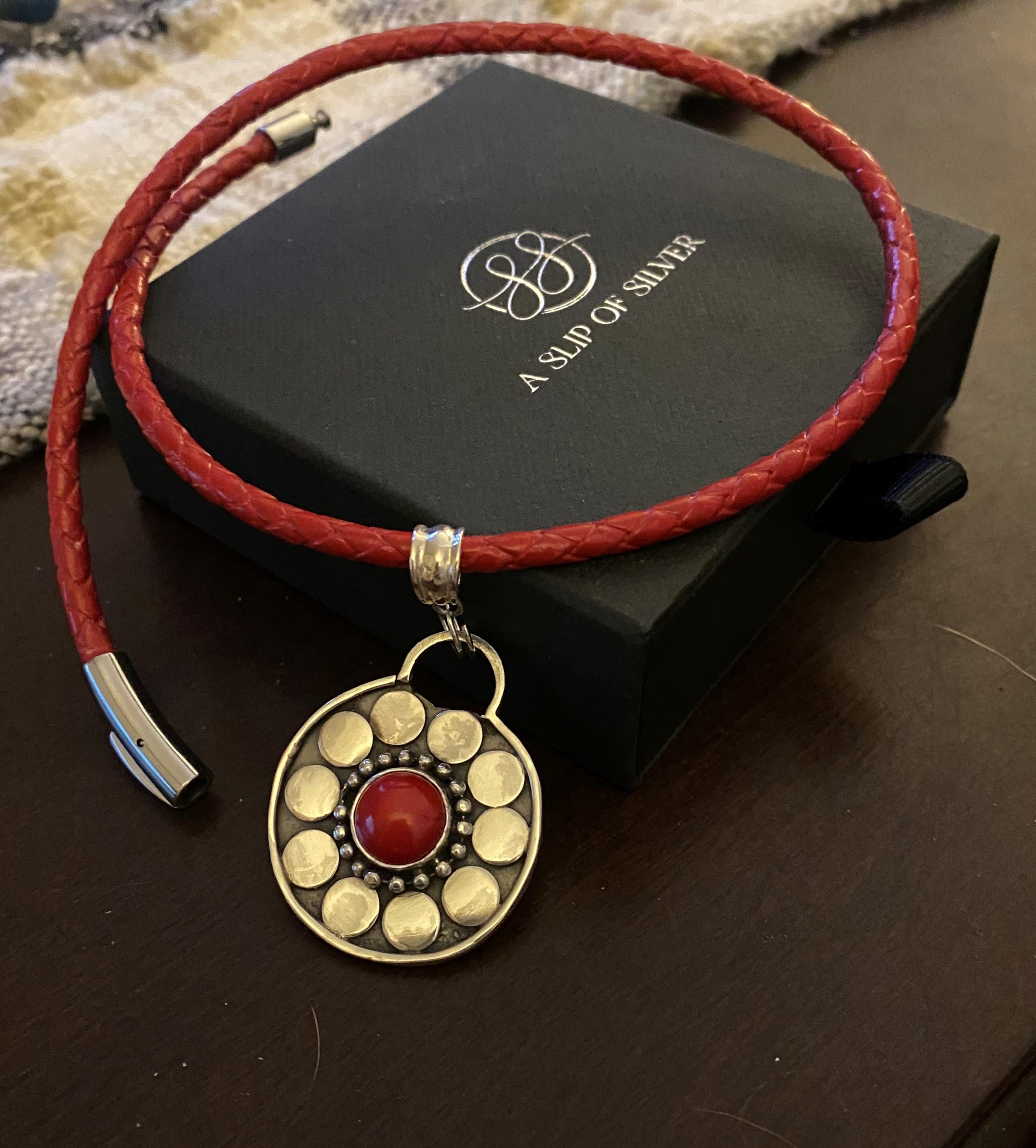 - The Chain is a 16” red leather cord w/sterling silver end caps